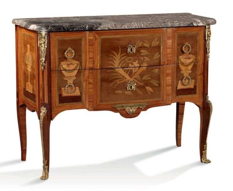 COMMODE SAUTEUSE à ressaut central et ressaut arrière en placage de bois précieux à décor de deux carquois surmontés de colombes, de vases à l'antique et de guirlandes de laurier sur fond de bois de tabac et filet d'encadrement en bois vert. Elle ouvre par deux tiroirs sans traverse. Montants à pans coupés terminés par des pieds galbés et facettés.