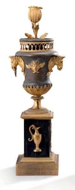 PAIRE DE VASES en bronze patiné et bronze ciselé doré à décor de têtes de chevaux, masque ailé et frise de feuilles d'eau et de grappes. Les bordures des vases sont surmontées d'une galerie ajourée.