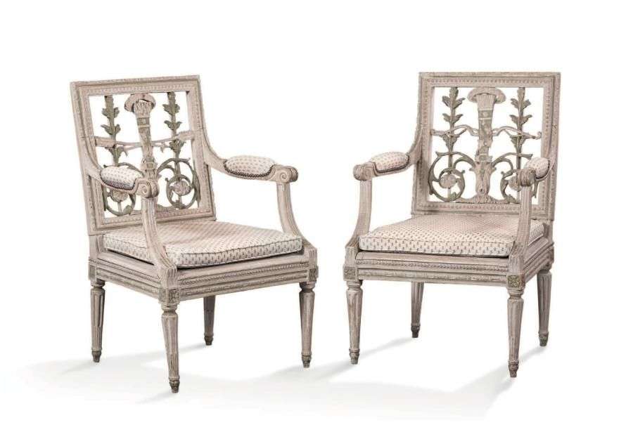 Le dossier plat de forme rectangulaire est ajouré à motifs de carquois, arc, flêches et rinceaux feuillagés.