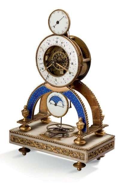 PENDULE SQUELETTE à indications multiples en bronze ciselé et doré à trois cadrans émaillés bleu, blanc et rouge. Le premier à l'amortissement indique les mois et les symboles astrologiques, le cadran principal présente les heures en chiffres romains et les minutes en chiffres arabes ainsi que les jours.