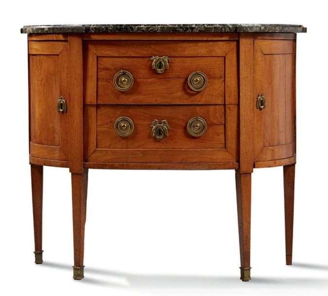 COMMODE de forme demi-lune en bois naturel, elle ouvre par deux tiroirs en façade et deux vantaux latéraux. Montant plats, pieds gaines terminés par des sabots de bronze.