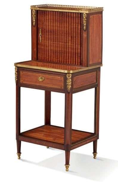 PETIT BUREAU BONHEUR DU JOUR de forme rectangulaire en placage de bois de rose et amarante. La partie supérieure ouvre par un volet coulissant découvrant une petite étagère. Un tiroir en ceinture. Il repose sur quatre pieds ornés de réserves et réunis par une entretoise.