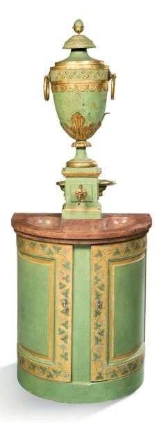FONTAINE DÉCORATIVE en tôle et bois laqué vert et or. La partie supérieure est ornée d'une urne à l'antique à décor de fleurettes, croisillons et acanthes reposant sur une base quadrangulaire et une large vasque en marbre rouge. La partie inférieure de forme demi-lune ouvre par deux vantaux en façade à décor de pampres de vignes.