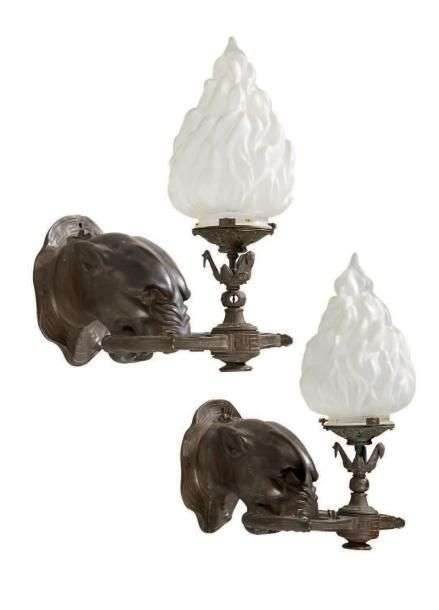PAIRE D'APPLIQUES en bronze à patine brune formées de tête de lions retenant dans leur gueules le bras de lumière stylisé couvert d'une flamme en vert moulé.