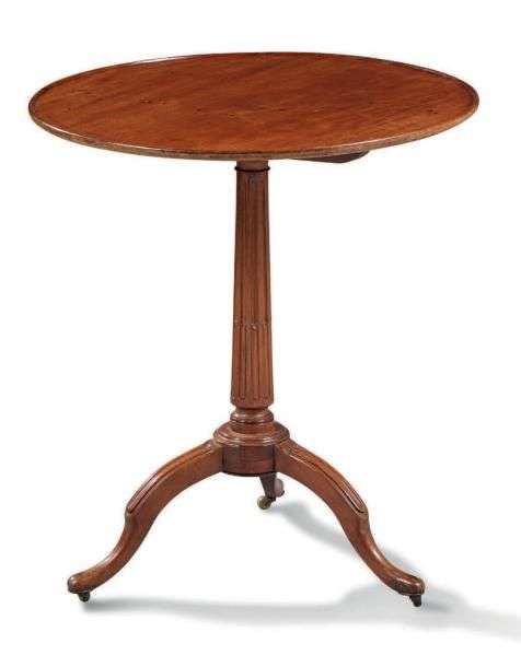 GUÉRIDON de forme circulaire en acajou. Le plateau basculant repose sur un fût central à cannelures rudentées et sur un piètement tripode à roulette.
