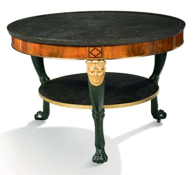 IMPORTANT GUÉRIDON de forme circulaire en placage d'acajou. La ceinture ornée de baguettes de laiton et de bois teinté noir à motifs géométriques repose sur un piètement tripode cambré en bois doré et bois noici à décor de masques empanachés et terminé par des pieds griffes.