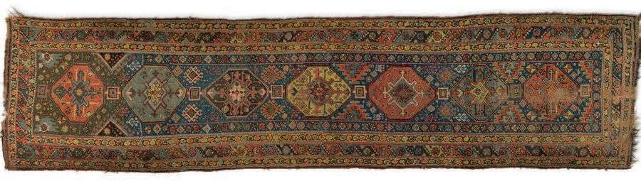 Bordure principale à semis de diamants multicolores en torsades et en forme de chenilles stylisées.