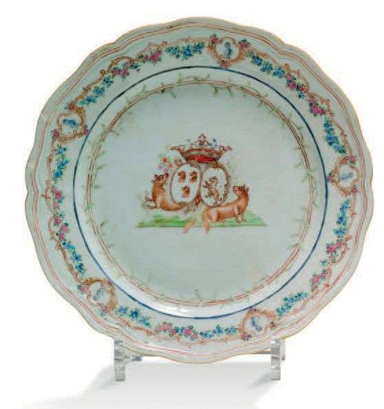 Deux assiettes armoriées en porcelaine polychrome, bordure chantournée.