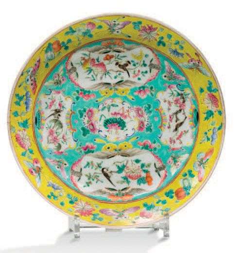 PAIRE D'ASSIETTES en porcelaine jaune et turquoise à décor polychrome de volatiles dans des branchages fleuris.