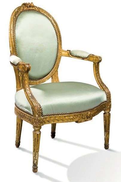 FAUTEUIL à dossier médaillon en bois doré mouluré et sculpté de fleurettes, frises d'entrelacs et acanthes. Pieds fuselés à cannelures rudentées.