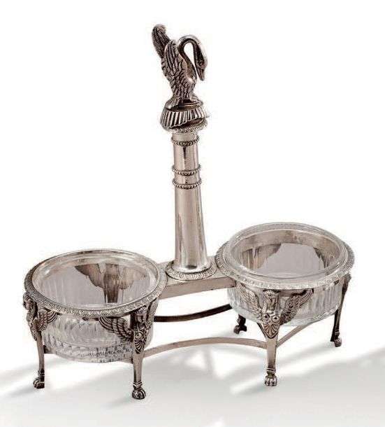 PAIRE DE SALERONS DOUBLES À MONTURE en argent, prise formée d'une colonne à rang de perles ornée d'un cygne. Réceptacles tripodes ornés de bustes d'égyptiennes ailées réunis par une entretoise.