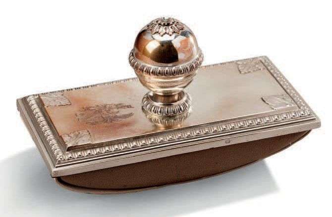 PORTE BUVARD en argent armorié à décor de frises de godrons et feuilles d'acanthes dans les écoinçons.