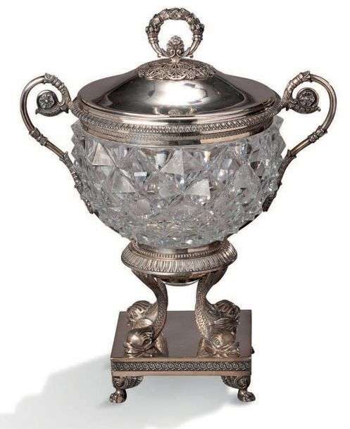 DRAGEOIR en cristal taillé et monture en argent, il repose sur quatre pieds formés par des dauphins stylisés. Base quadrangulaire ornée d'une frise de piastres reposant sur quatre pieds griffes.
