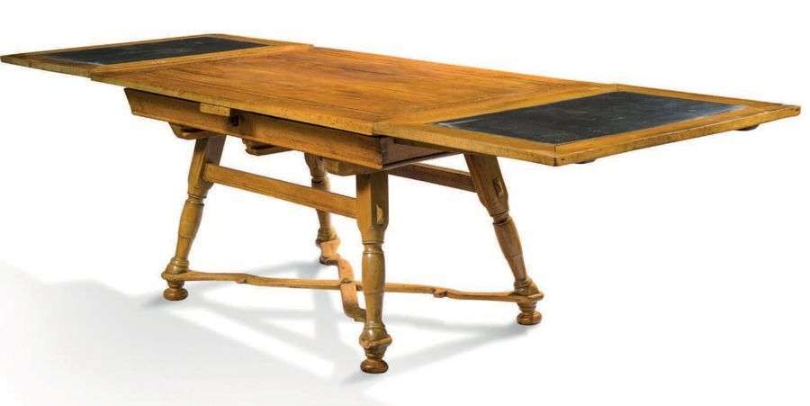 TABLE À PLATEAU rectangulaire à filets marqueté en bois fruitier à deux allonges à l'italienne à dessus en ardoise| le piètement trapézoidale réuni par une entretoise en X.