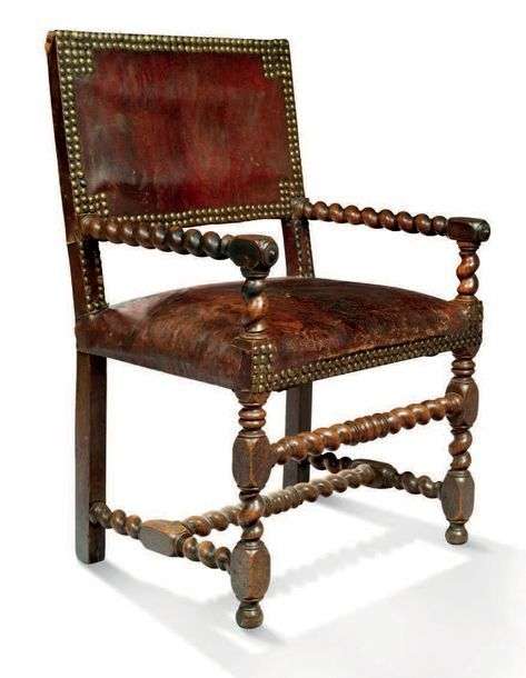 UNE CHAISE À BRAS en bois tourné, entretoise en H, garniture de cuir clouté.