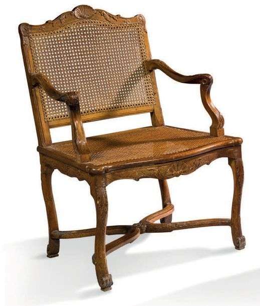 DEUX FAUTEUILS à assises et dossiers cannés en bois naturel mouluré sculpté à motifs rocaille de coquilles et rinceaux feuillagés. Ceinture chantournée, supports d'accotoir et pieds cambrés réunis par une entretoise en X.