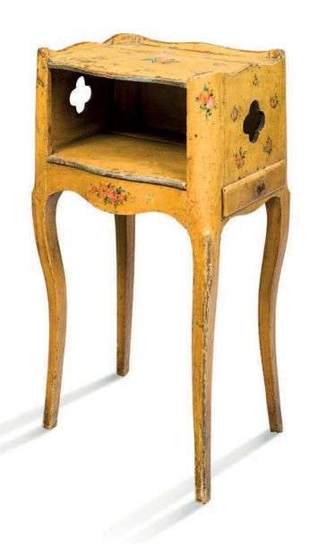 PETITE TABLE DE NUIT en bois laqué jaune et à décor polychrome de fleurettes. Caisson central ajouré de motifs polylobés. Elle ouvre par un tiroir latéral. Pieds cambrés.