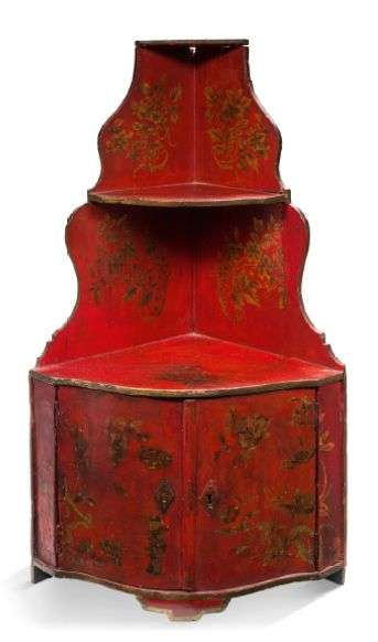 ETAGÈRE EN ENCOIGNURE en bois laqué rouge ouvrant en partie basse par deux vantaux et la partie supérieure de forme violonée présente deux tablettes. Décor peint couleur or et polychrome de branchages fleuris et d'un personnage en tenue traditionnelle. XVIIIe siècle H: 76,5 - L: 40 - P: 28 cm Usures