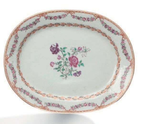 Soupière et son présentoir ovales en porcelaine polychrome et rehauts d'or à décor de guirlandes de fleurs et frises de fleurons. Prise en forme de fleur.