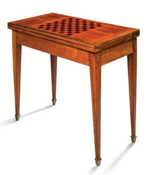 TABLE À JEUX rectangulaire en marqueterie à plateau dépliant à décor de damier| pieds fuselés à pans coupés.