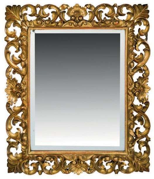 MIROIR en bois sculpté doré et ajouré de rinceaux et palmettes.
