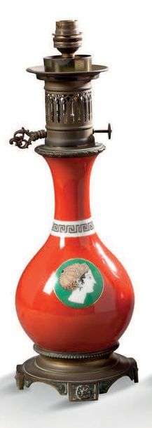 PAIRE DE LAMPES de forme balustre en porcelaine à fond orange à décor de médaillons représentant des profils de personnages grecs à fond vert.