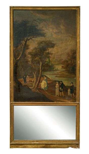 TRUMEAU en bois doré à décor peint d'une scène naïve.