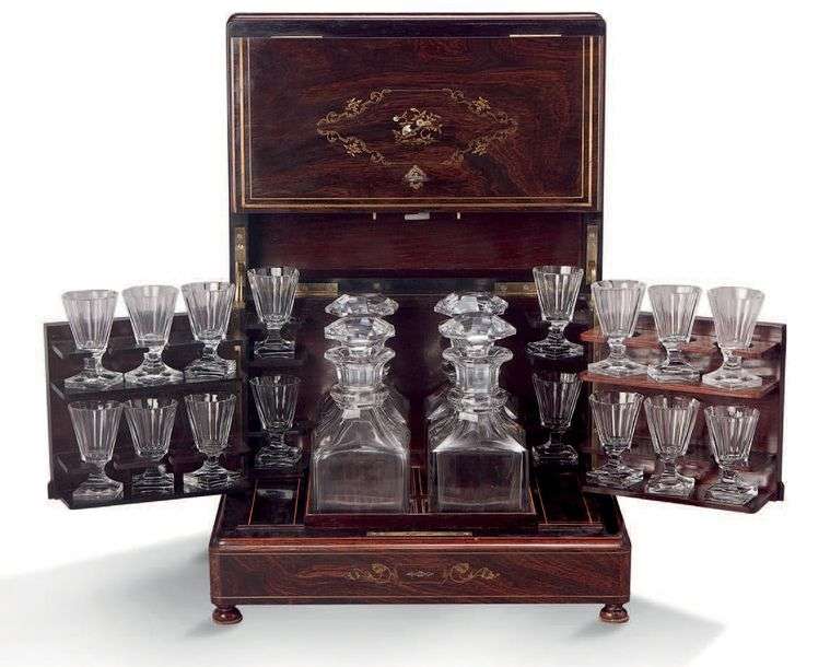 CAVE À LIQUEUR en bois de placage et filets de laiton et nacre comprenant