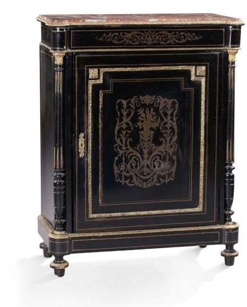 MEUBLE D'ENTRE-DEUX en placage d'ébène et bois noirci à décor en marqueterie de laiton. Il ouvre par une porte en façade. Montants à colonnes. Plateau de marbre rouge veiné encastré.