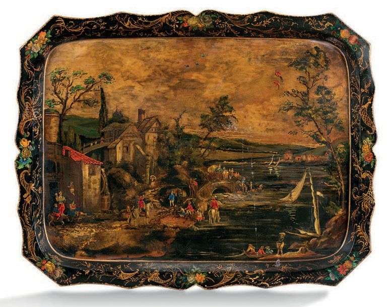 IMPORTANT PLATEAU RECTANGULAIRE en tôle laquée polychrome et or à décor de scènes animées dans un village au ruisseau.
