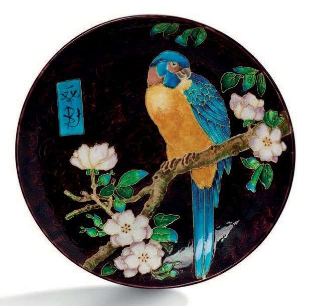 Paire de plats circulaire en céramique polychrome à décor de perroquets dans des branchages fleuris.