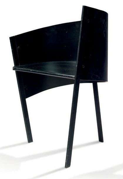 PAIRE DE FAUTEUILS à dossier gondole renversé en métal laqué noir, piètement tripode.