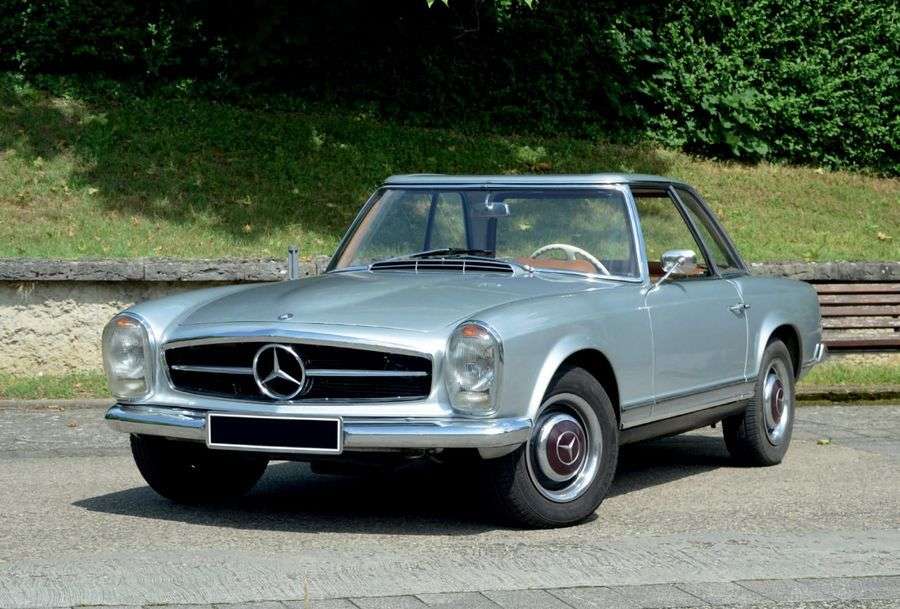 Auréolé du succès international de ses versions 300 SL et 190 SL, Mercedes-Benz fait sensation en dévoilant au salon de Genève 1963 son nouveau roadster: la 230 SL. Sa ligne élégante teintée de sportivité séduit et met en exergue le talent du jeune designer français Paul Bracq. Eu égard à son hard top au toit concave qui rappelle les monuments bouddhistes, le surnom de «Pagode» est ajouté au patronyme SL. Elle est équipée d'office d'un moteur 6 cylindres en ligne de 2, 3 litres alimenté par une injection directe Bosch qui développe 150 ch et 22 mkg de couple. Côté transmission, elle était équipée de série d'une boîte mécanique à 4 rapports (5 rapports en option) ou d'une boîte automatique à 4 vitesses.