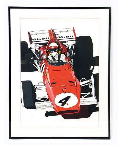 Très belle lithographie représentant la Ferrari de Clay Regazzoni vainqueur du Grand prix de Monza 1970