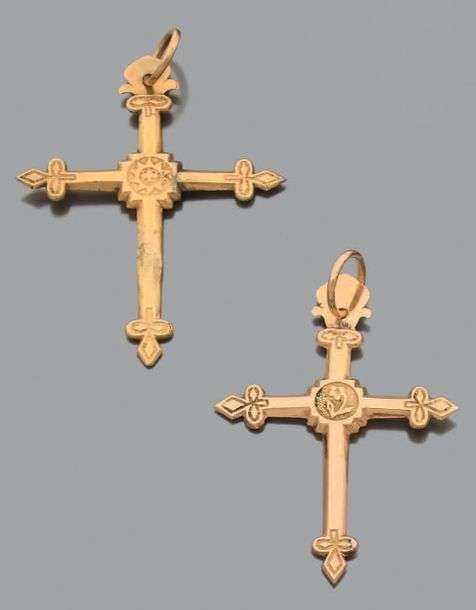Deux croix en or jaune 18K (750) ciselé.