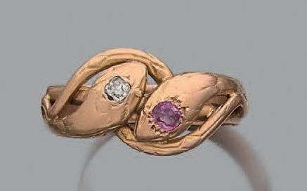 Bague en or jaune 18K (750) formée de deux serpents enlacés sertis d'un diamant de taille ancienne et d'une pierre rose.