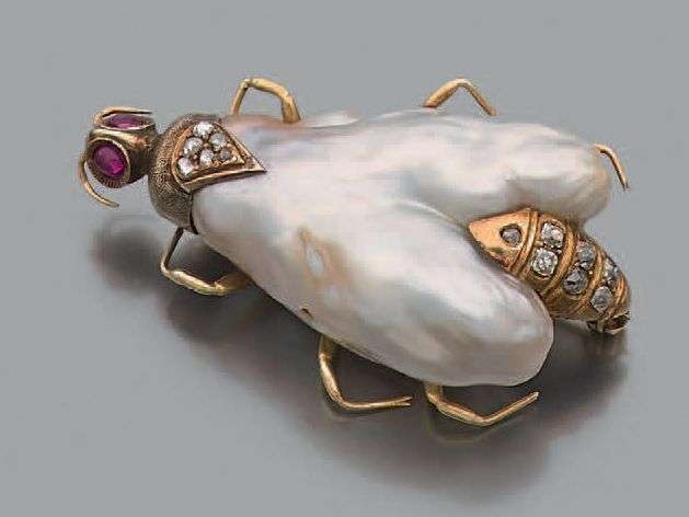 Broche "insecte" en or jaune 14K (585) ornée d'une soufflure de perle naturelle rehaussée de diamants et de rubis pour les yeux.
