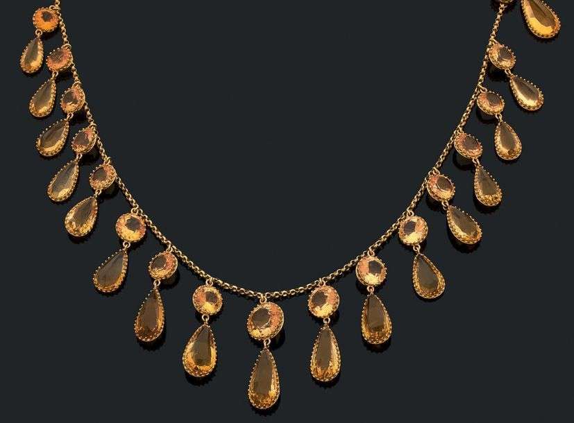 A yellow gold necklace set with citrines.