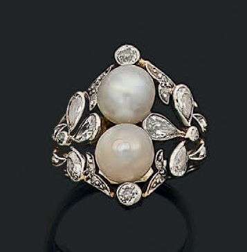 Bague en platine (950) et jaune 18k (750) sertie de deux perles supposées fines - non testées - épaulées de fleurs serties de diamants de taille ancienne. Fin XIXème.