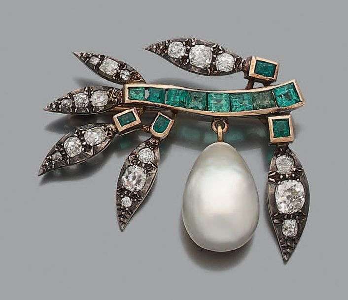 A yellow gold and silver brooch set with diamonds and emeralds, supporting a drop pearl.