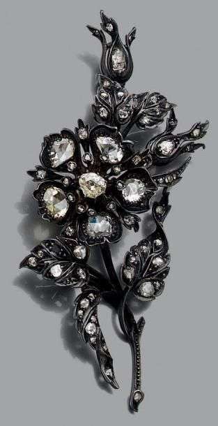 Broche «trembleuse» en or jaune 18k (750) et argent (<800) sertie de diamants taillés en rose.