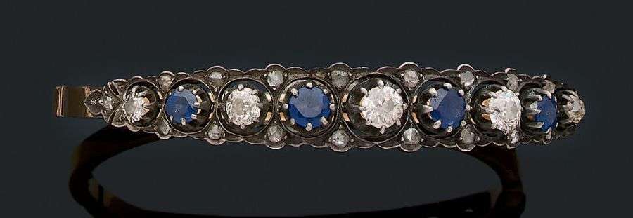 Bracelet jonc en or jaune 18k (750) et argent (<800) serti d'une ligne de diamants de taille ancienne et de saphirs alternés de diamants taillés en rose. Epoque XIXème.