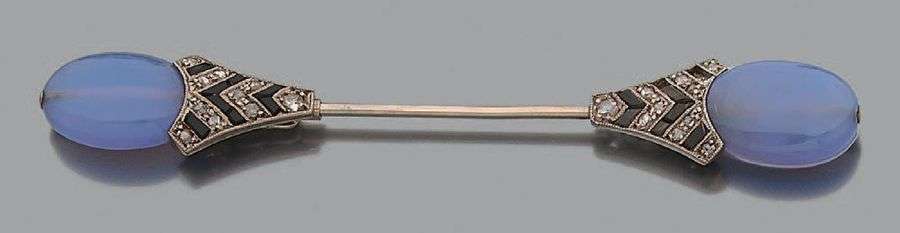 A white gold and platinum pin set with chalcedonies, diamonds and onyx. Some lacks.