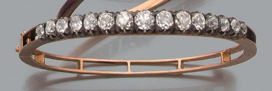 Bracelet jonc en or jaune 18k (750) et argent serti d'une ligne de diamants de taille ancienne. Epoque XIXème