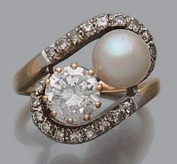 Bague "toi et moi" en or jaune et gris 18k (750) sertie d'un diamant de taille ancienne et d'une perle de culture soulignés d'une volute sertie de diamants taille huit huit.
