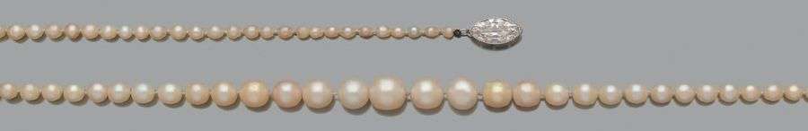 Collier composé de 93 perles fines en chute et de 4 perles de culture.