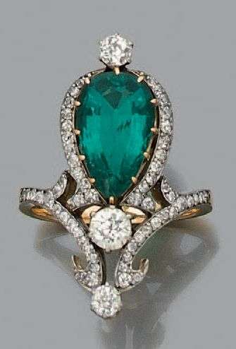 Bague "duchesse" en or jaune et gris 18k (750) sertie d'une émeraude en poire dans un entourage de diamants de taille ancienne.