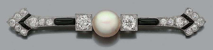 A platinum and white gold brooch set with an important natural pearl between diamonds and onyx.