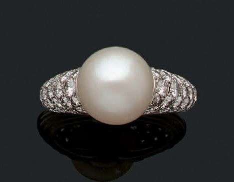 Bague en platine (950) ornée d'une perle fine ronde épaulée de deux pavages de diamants de taille brillant.