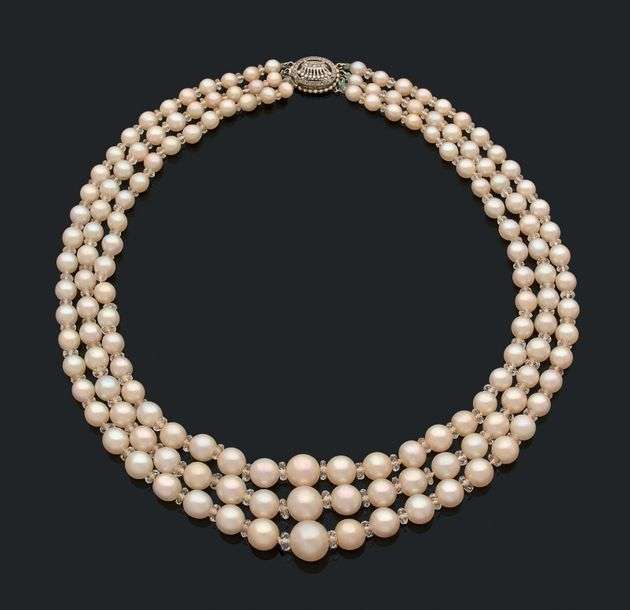 Collier composé de trois rangs de 46, 50 et 53 perles comprenant 69 perles fines en chute et 79 perles de culture.